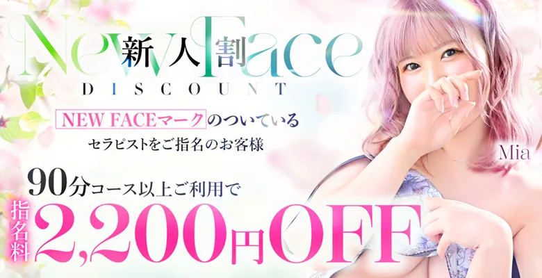 対象:新規・会員(本指名対象外) NEW FACEマークのついているセラピストをご指名のお客様 90分以上のコースご利用で指名料2,200円OFF 併用可能なキャンペーン ■事前予約スタート割(3,300円OFF) ■アンケート割(1,100円OFF~) ■口コミ割(2,200円OFF~) ■Googleレビュー割(1,100円OFF~) ■ポイント割(100円OFF~) 【別途】 ・入会金/1,100円 ・交通費/立川駅周辺無料・その他1,100円~ |