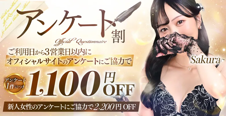 対象:会員様 ご利用日から3営業日以内にオフィシャルサイトの アンケートにご協力いただいたお客様限定 90分以上のコース料金から1件につき1,100円OFF 新人女性とお遊びいただきアンケートにご協力いただいたお客様 90分以上のコース料金から1件につき2,200円OFF 【注意事項】 アンケート割は使用せずお貯めいただくことも可能です。 口コミ割やGoogleレビュー割と併用してご利用いただき 一度のご利用で最大5,500円分までまとめてご利用いただけます。 併用可能なキャンペーン ■事前予約スタート割(3,300円OFF) ■新人割(指名料2,200円OFF) ■口コミ割(2,200円OFF~) ■Googleレビュー割(1,100円OFF~) ■ポイント割(100円OFF~) 【別途】 ・指名料/2,200円 ・ランク料金/SILVER1,100円~DIAMOND5,500円(各種ランクに応じて) ・交通費/立川駅周辺無料・その他1,100円~ |