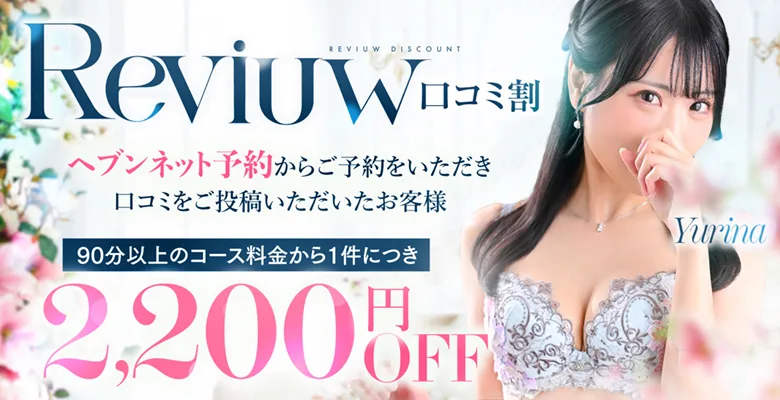 対象:ネット予約でお遊び後口コミを投稿いただいたお客様 『ヘブンネット予約』からご予約をいただき ご利用後口コミをご投稿いただいたお客様限定で 90分以上のコース料金から1件につき2,200円OFF 【注意事項】 口コミ割は使用せずお貯めいただくことも可能です。 アンケート割やGoogleレビュー割と併用してご利用いただき 一度のご利用で最大5,500円分までまとめてご利用いただけます。 併用可能なキャンペーン ■事前予約スタート割(3,300円OFF) ■新人割(指名料2,200円OFF) ■アンケート割(1,100円OFF~) ■Googleレビュー割(1,100円OFF~) ■ポイント割(100円OFF~) 【別途】 ・指名料/2,200円 ・ランク料金/SILVER1,100円~DIAMOND5,500円(各種ランクに応じて) ・交通費/立川駅周辺無料・その他1,100円~ |