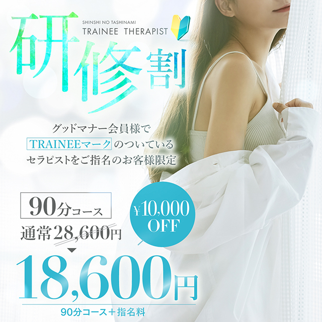 入店したばかりの女性は研修セラピストとなり、グッドマナー会員様は10,000円OFFでご利用可能でございます。そんなどデカい割引は紳士の嗜みでしかありません!